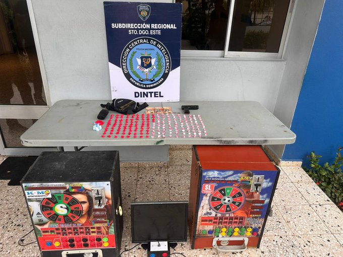 SANTO DOMINGO ESTE.– Agentes de la Subdirección Regional de Inteligencia Santo Domingo Oriental (Dintel), de la Policía Nacional, realizaron varios operativos en distintos sectores de Santo Domingo Este, donde ocuparon sustancias narcóticas, máquinas de juego ilegal y un arma de fuego de fabricación casera.