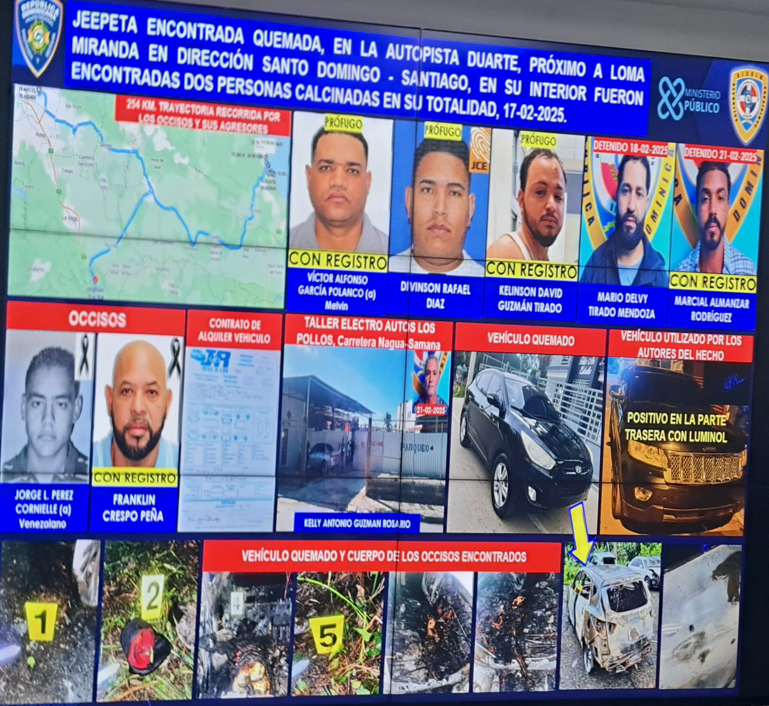 La Policía Nacional informó este lunes que, tras una ardua labor de investigación y labores de inteligencia y rastreo, en conjunto con el Ministerio Público, logró la captura de dos de los cinco hombres señalados como presuntos responsables del asesinato de dos personas, cuyos cuerpos fueron encontrados calcinados dentro de una jeepeta en la autopista Duarte, cerca de Loma Miranda, provincia Monseñor Nouel.