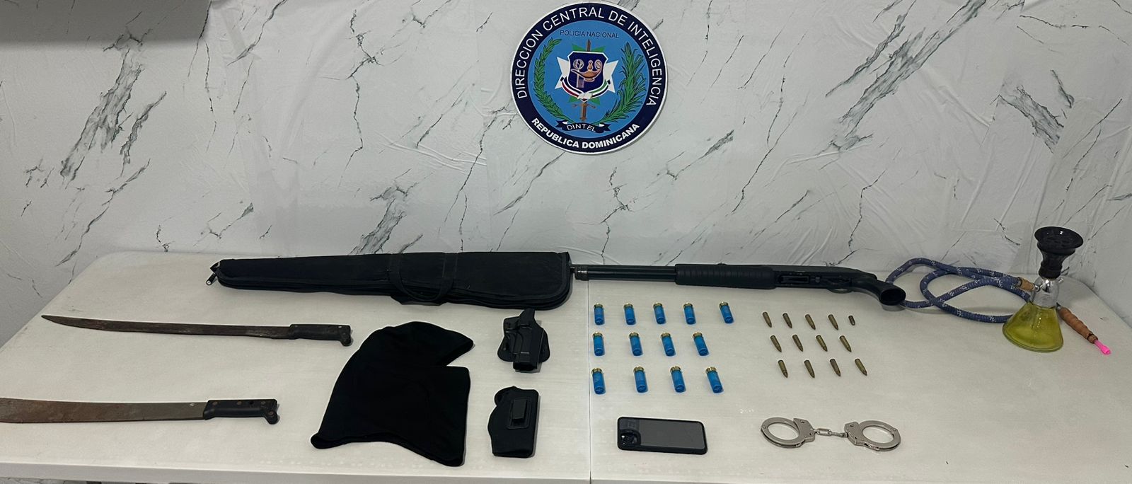 Como resultado de la acción, fueron ocupadas las siguientes evidencias: una escopeta calibre 12, marca ESCORT, serie No. 178684, de procedencia ilegal; cartuchos de distintos calibres; dos armas blancas; un pasamontañas; dos cananas para pistola; un par de esposas; un celular y una hookah.
