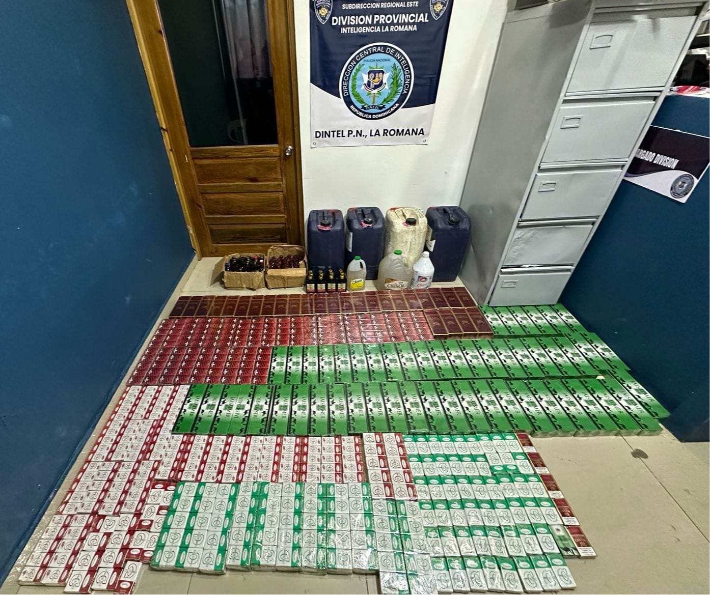 Santo Domingo, R.D.- Policía Nacional reporta que, oficiales de la División Provincial de Inteligencia (Dintel), en coordinación con miembros de la Policía Preventiva, decomisaron más de 32 mil unidades de cigarrillos de contrabando y 43 galones de alcohol adulterado durante un operativo realizado en el sector Villa Hermosa, provincia La Romana.