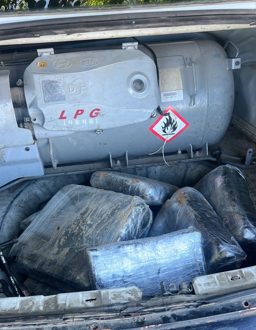 Durante la inspección del vehículo, los miembros del ERD detectaron un tanque adaptado en la parte inferior, dentro del cual fueron localizados diez (10) paquetes de un vegetal de color verde, envueltos en cinta adhesiva y plástico negro, presumiblemente marihuana.