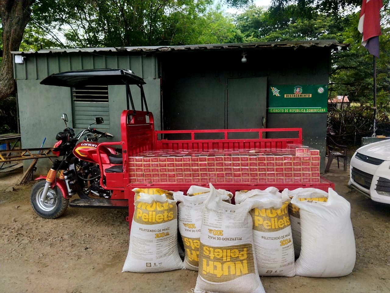 Dajabón, República Dominicana.- Un contrabando de 98,600 unidades de cigarrillos fue ocupado por miembros del Ejército de República Dominicana, destacados en el Puesto de Chequeo Militar El Vico, en una motocicleta de tres ruedas interceptada en Dajabón.