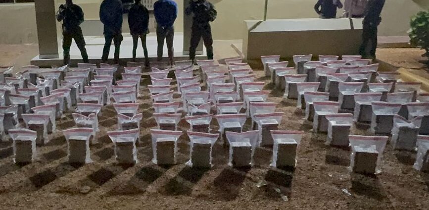 Posteriormente, fue allanada otra casa del imputado y un hombre que se encuentra prófugo, identificado como el Fay, la cual se encuentra ubicada en la carretera Cambita Garabitos, Los Cacaos, donde, luego de que las autoridades registraran el inmueble, el pasado 30 de noviembre, fue ocupada una mochila que contenía en su interior una funda plástica transparente, con la cantidad de setenta y seis (76) porciones de un polvo blanco, presumiblemente, cocaína.