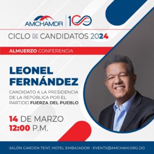 SANTO DOMINGO, R.D.- El candidato presidencial del partido Fuerza del Pueblo (FP), Leonel Fernández, participará este jueves en el primer encuentro del “Ciclo de Almuerzos con los Candidatos Presidenciales”, que organiza la Cámara Americana de Comercio de la República Dominicana (AMCHAMDR).