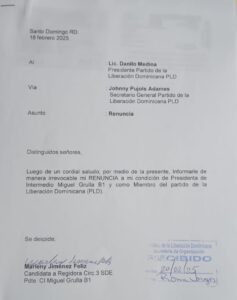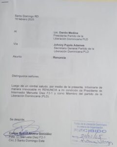Los nuevos renunciantes mediante cartas dirigidas al presidente y secretario general del PLD son Dilenia Alcántara; Marley Jiménez Feliz, excandidata regidora de la Circunscripción No. 3, SDE y presidenta del comité Intermedio Miguel Grulla B1; Denia Villanueva Pontier, coordinadora de la mujer en la misma circunscripción, presidenta del Comité Intermedio Miguel Grullón A1-B; Carlos Daniel Rivera González, presidente Intermedio Manuela Diez F2-1, Circunscripción No.3, SDE y, Ray Leonardo Alcántara, presidente Intermedio Simón Orozco C3-1, SDE, Circunscripción No.3, respectivamente.